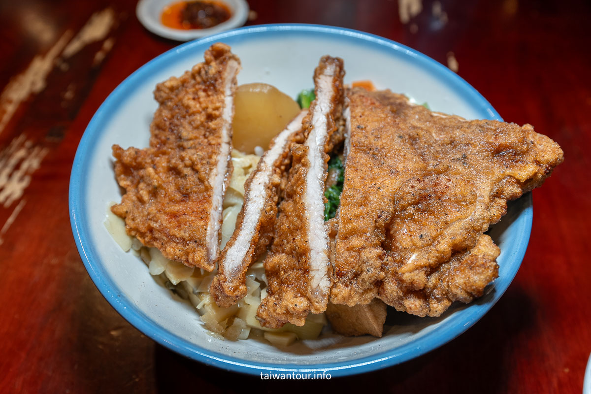 厚道飲食店之所以叫「厚道」,就是因為它的排骨厚實度非常有感!排骨不裹厚粉,而是先滷後炸,鎖住肉汁。外皮酥脆帶點微甜,肉質紮實有咬勁,咬下去還能感受到淡淡的黑胡椒香氣。碗底鋪滿了古早味的靈魂三要素:酸菜、滷蛋、筍絲(有時會有高麗菜或滷肉燥)。鹹香的滷肉汁滲進白飯裡,配上酸菜的解膩,真的會讓人不自覺把整碗飯扒光。
