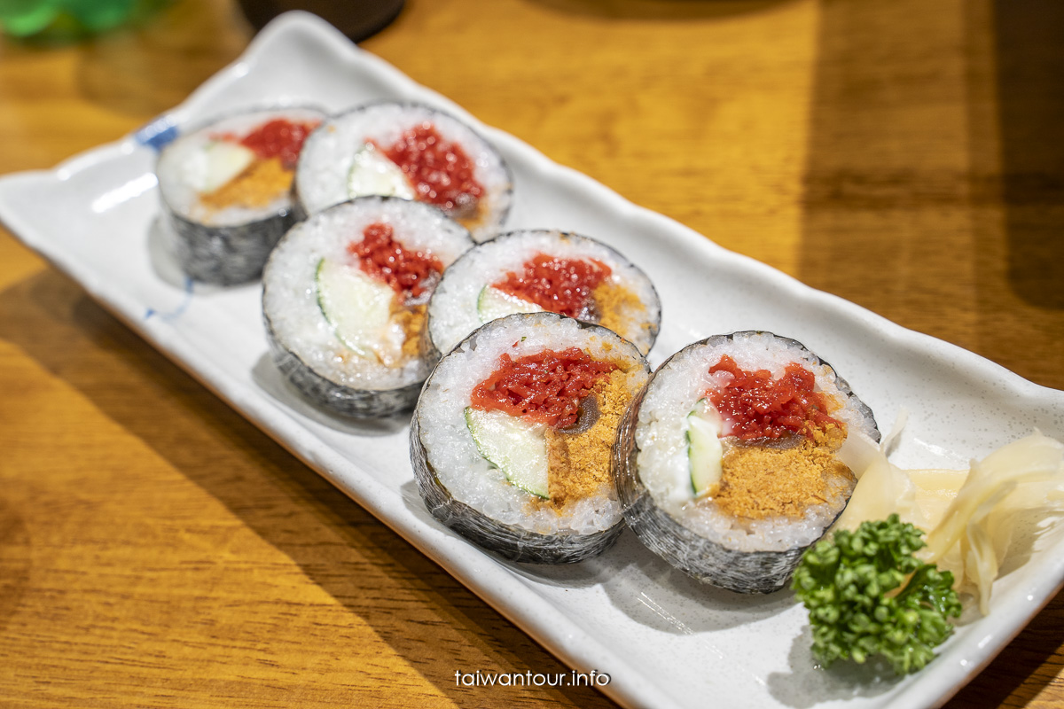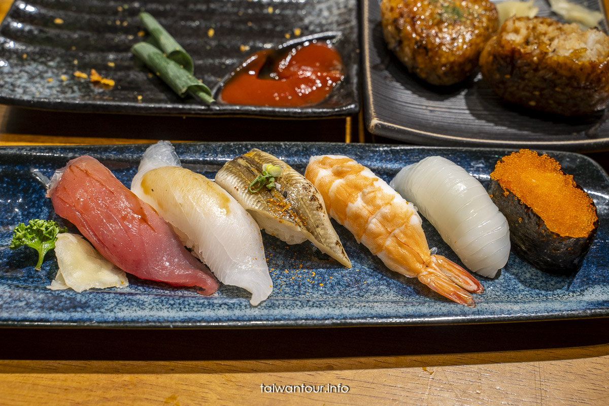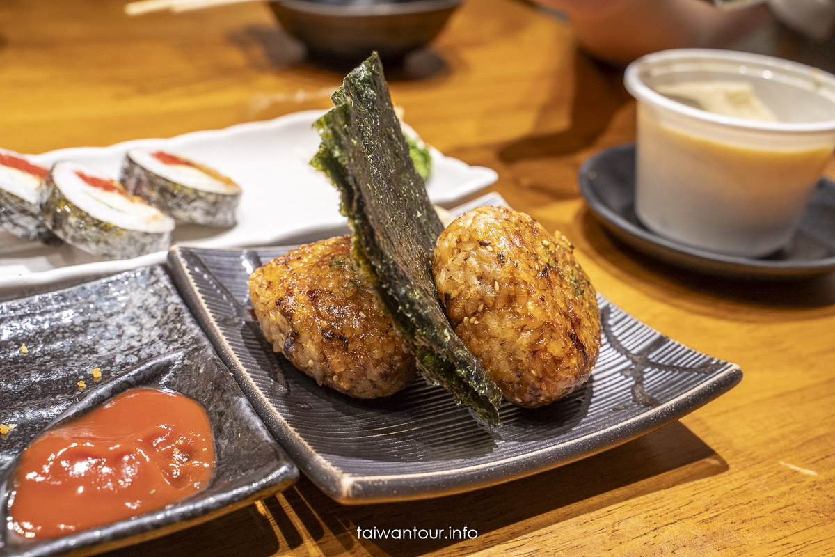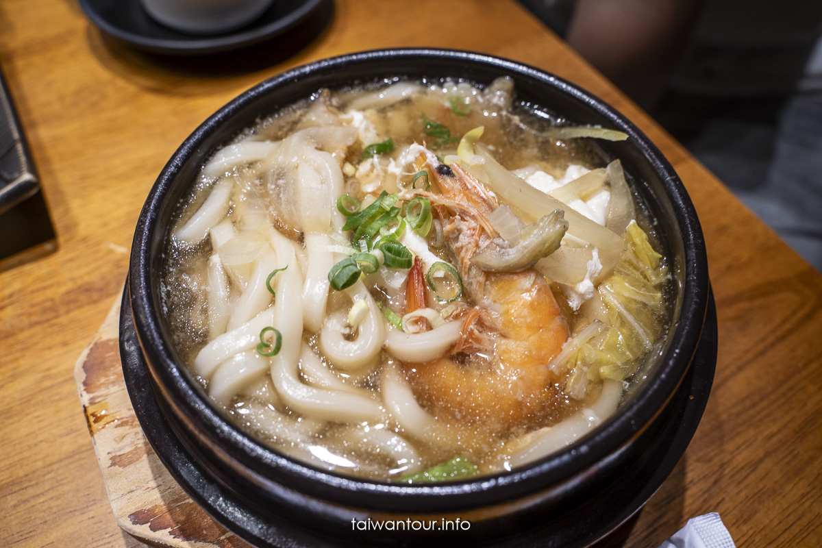 綜合握壽司,生魚片切得非常有誠意(厚度很有誠意!),色澤亮麗,烤飯糰外皮烤得像鍋巴一樣酥脆,刷上鹹甜適中的特製日式醬汁,香氣非常濃郁。海鮮湯烏龍麵,湯頭是用日式高湯與多種海鮮熬煮,喝起來清甜不膩,有大蝦、蛤蜊、魚板、時蔬等。