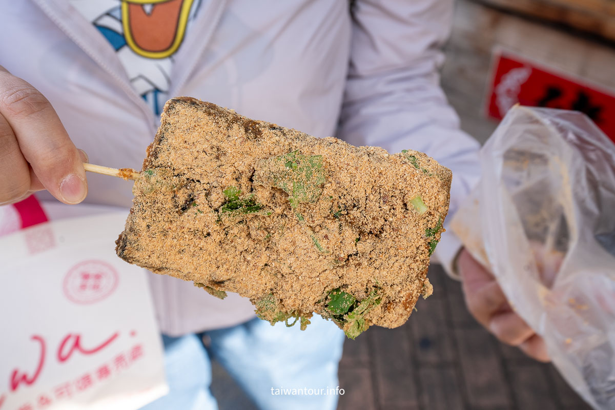 如果你去鶯歌老街捏陶、逛街,這間阿婆豬血糕絕對是必吃的散步美食,這裡的豬血糕長度很有誠意,切成長條狀方便食用。花生粉磨得比較細,香氣濃郁且給得毫不吝嗇,整支裹得滿滿的。
