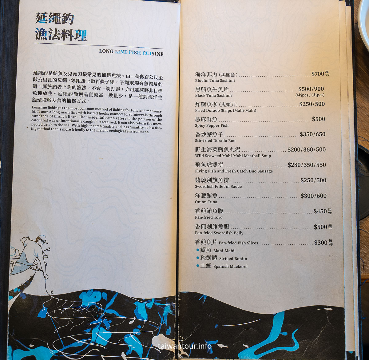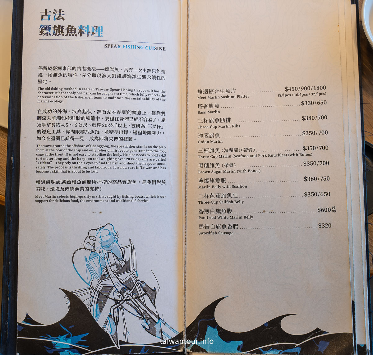 鏢旗魚(鏢刺漁法)這是店內最核心的堅持。鏢旗魚是一種具備「友善海洋、永續經營」特點的古老捕魚法。漁民站在船頭的鏢台上,在波濤洶湧的大海中與魚搏鬥,僅捕捉夠大、成熟的魚隻。這種方法不會像流刺網那樣對海洋生態造成毀滅性破壞,也能保持魚身完整,不因掙扎而產生乳酸,確保肉質處於頂級狀態。