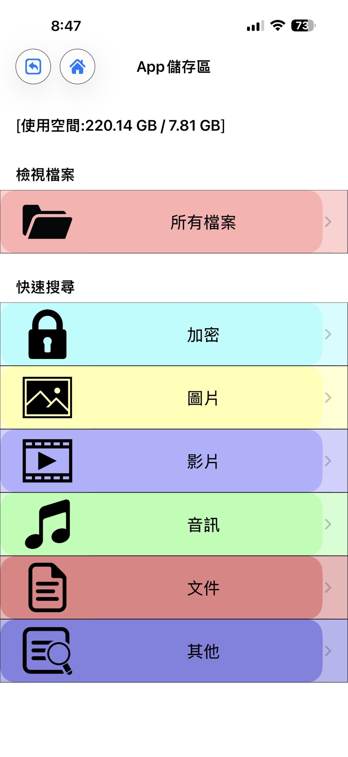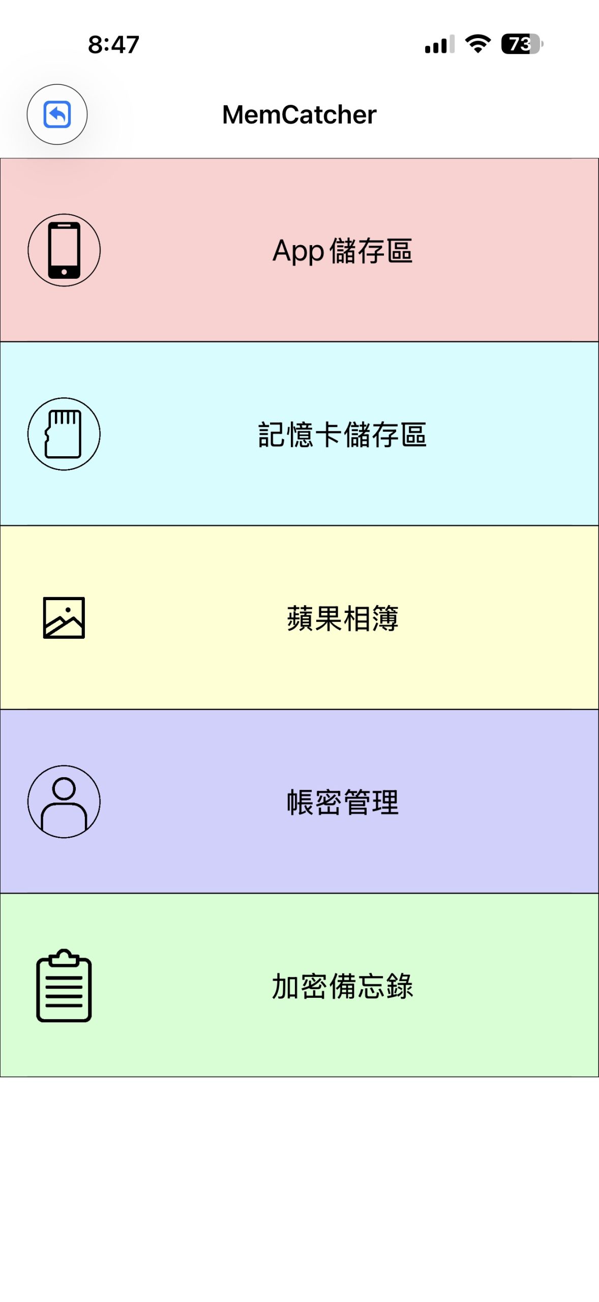 【回憶捕手 Link A款】的APP功能很豐富,有APP儲存區、記憶卡儲存區、蘋果相簿、帳密管理和加密備忘錄。