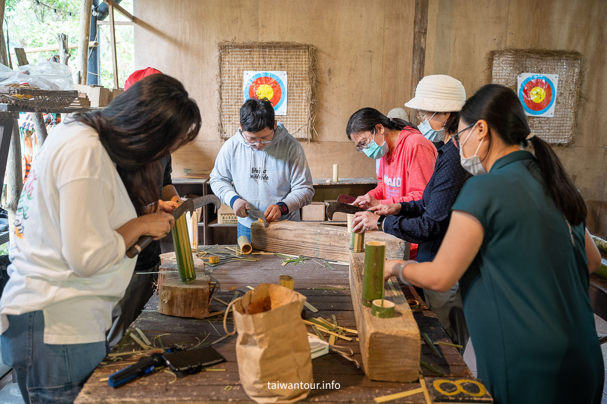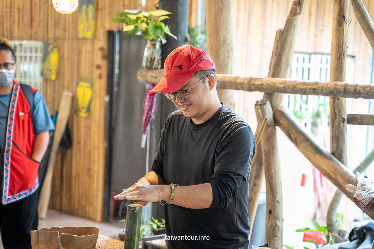 吃完獵人餐,接著在這裡體驗竹筒杯DIY,過程中的鋸子、砍刀和砂紙,這是許多人平時很少接觸的工具,特別是女生們,更是難得的體驗。在族人的指導下,我們一步步將竹子去皮、打磨,讓竹子的濕氣慢慢釋放,最後再綁上扣環,一個專屬於自己的竹杯就完成了!
